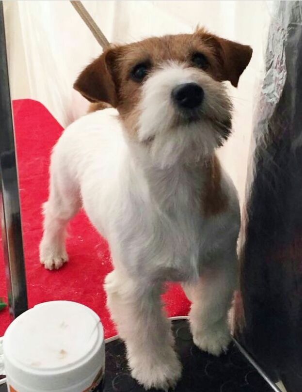 La testa del Jack Russell Terrier a pelo ruvido và strippata facendo molto attenzione; useremo principalmente le mani, che “strapperanno” il pelo.La barba và sistemata leggermente, le sopracciglia vanno tenute separate e della lunghezza di 2cm circa, lo stop deve essere ben pulito, così come le orecchie, la fronte e le guance.