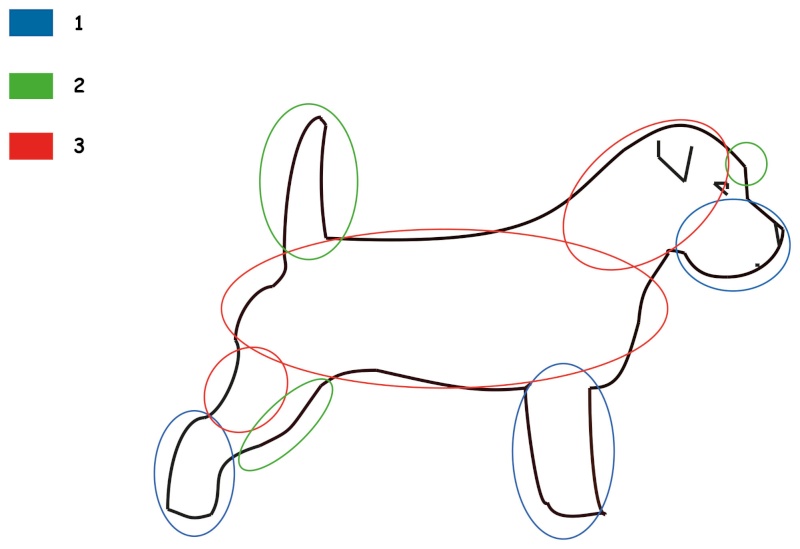 Nella figura al lato abbiamo inserito un modello ” Jack ” suddiviso in ellissi, ognuna di queste ultime contraddistinta da un colore che indica la lunghezza del pelo a seconda le varie zone del cane.